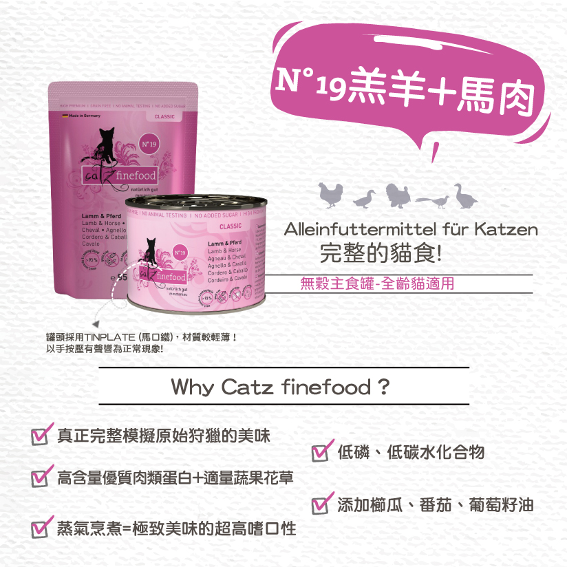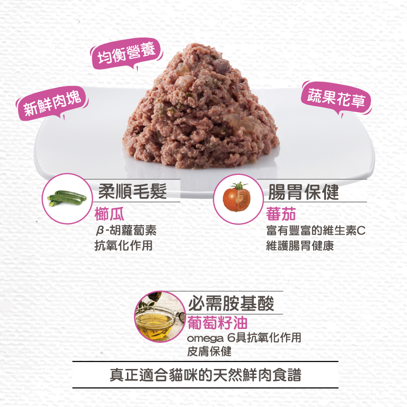 羔羊肉* 50%(由心臟、新鮮肉塊、肝臟和肺組成),羊肉和馬肉湯 23.6%,馬肉** 20%(由新鮮肉塊、心臟和肝臟組成),櫛瓜 3%,番茄 2%,礦物質 1 %,生薑 0.2%,葡萄籽油 0.2% *羔羊肉部分內含:新鮮肉塊和心臟約 70%(各佔1/2),肝臟和肺臟約 30%(各佔1/2) ** 馬肉部分內含:2/3 新鮮肉塊,1/3 內臟(其中 2/3 心臟和 1/3 肝臟) |
