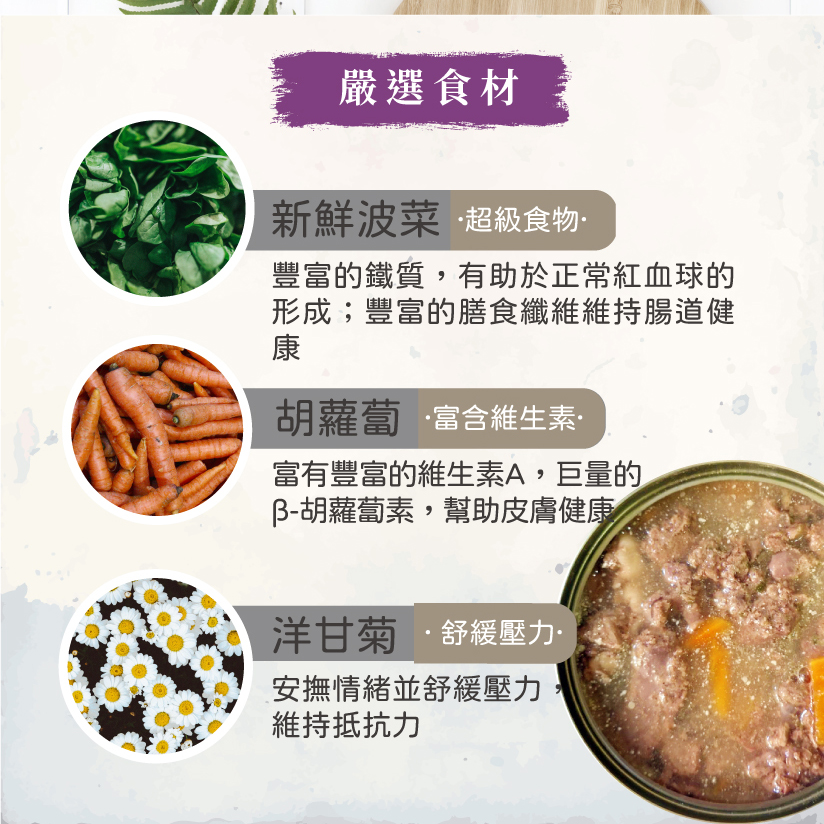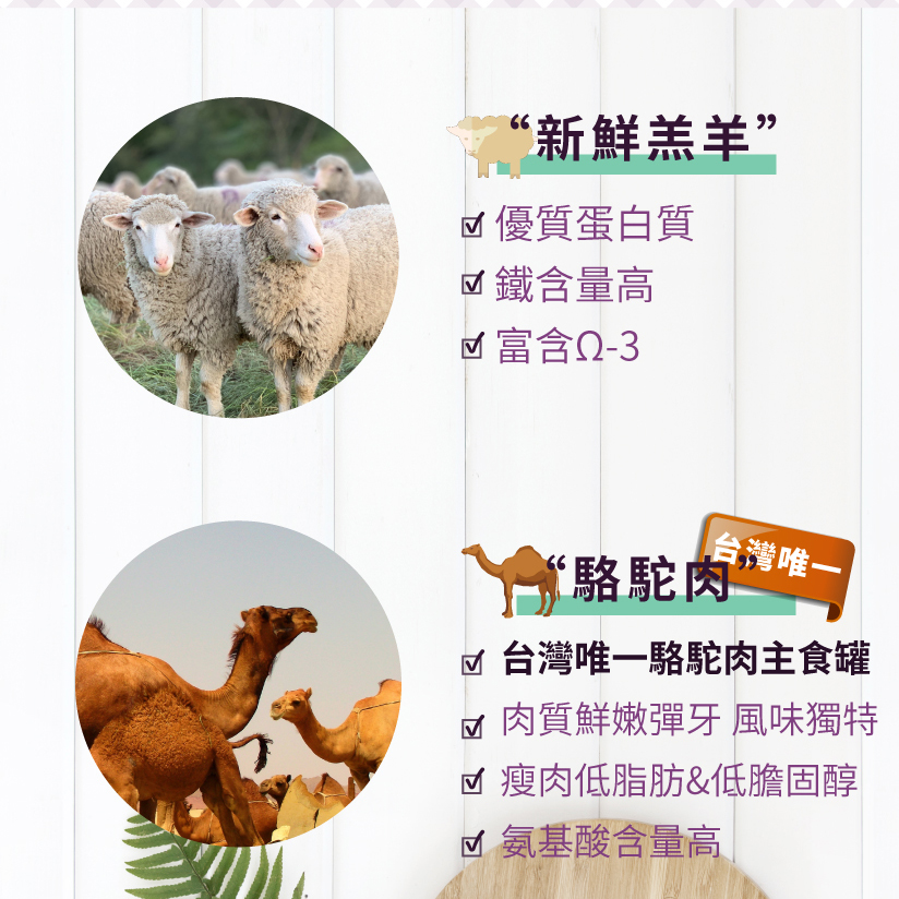 主要成分 羔羊和駱駝原汁燉肉湯27.2%、胡蘿蔔3.5%,菠菜0.5%, 礦物質 0.5%,紅花籽油 0.2%, 洋甘菊 0.1% |